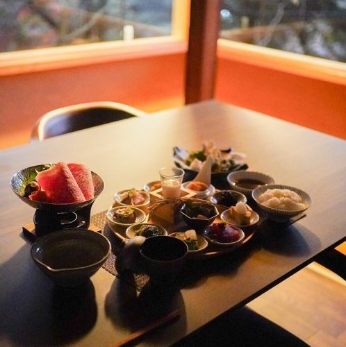 心を癒す日常から離れたひとときをお楽しみください。窓からは美しい自然が広がり、四季の移ろいを感じられます。提供される料理は丁寧に仕上げられたものばかりで、口に運ぶごとに豊かな旨味が広がります。酒と肴の絶妙な組み合わせが、心を和ませる特別な時間を演出します。